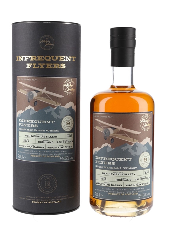 A bottle of Ben Nevis 9 Year Old Infrequent Flyers Single Malt Scotch Whisky. This was distilled on 21 November 2011, matured in a Virgin oak cask and bottled in March 2021 by Alastair Walker Whisky Company Ltd.