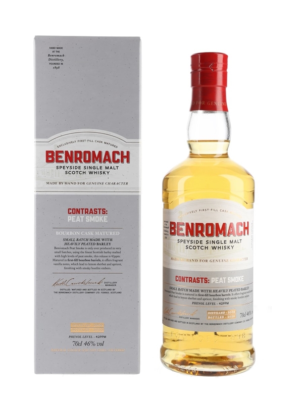 A bottle of Benromach Contrasts:Peat Smoke Single Malt Scotch Whisky. This was distilled from heavily peated barley in 2009, matured in first fill bourbon barrels and bottled in 2020.