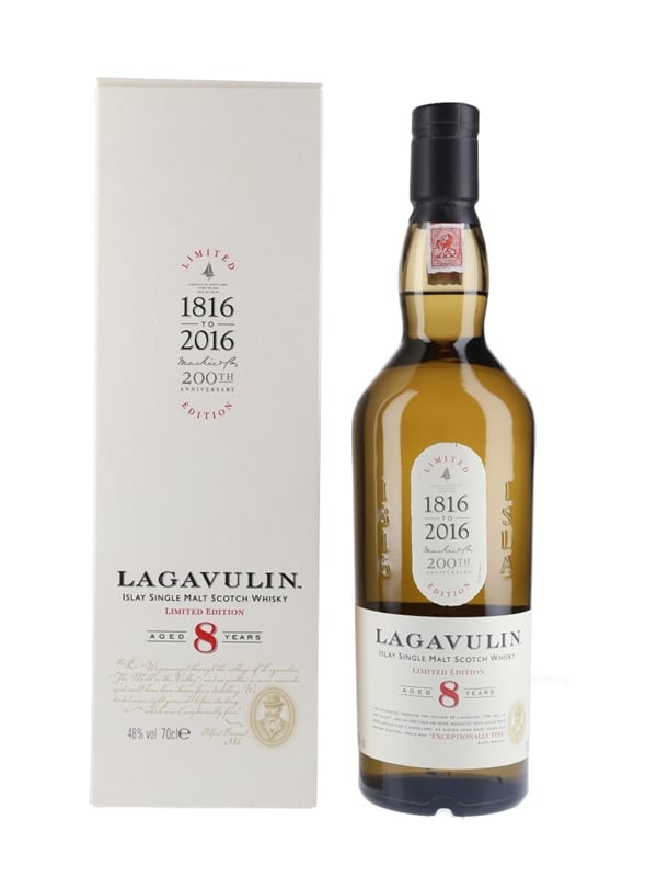 A bottle of Lagavulin 8 Year Old Limited Edition Islay Single Malt Scotch Whisky. This was released to commemorate the 200th anniversary of the founding of Lagavulin distillery by John Johnston in 1816.