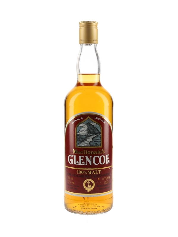 A bottle of MacDonald's Glencoe 8 Year Old 100 Proof Pure Highland Malt Scotch Whisky, produced and bottled by R N MacDonald. We estimate this was bottled in the 1980s.