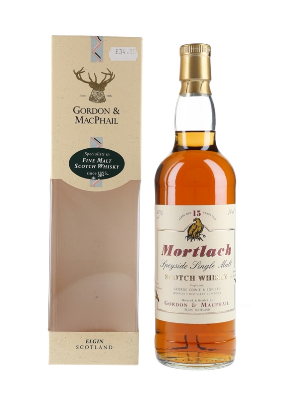 A bottle of Mortlach 15 Year Old Speyside Single Malt Scotch Whisky from independent bottler Gordon & MacPhail.
