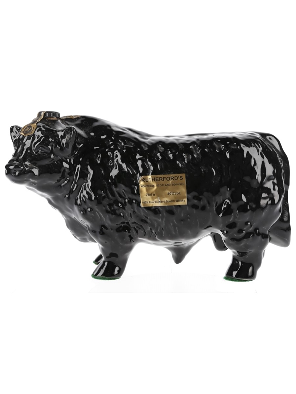 A bottle of Rutherford's 100% Fine Blended Scotch Whisky presented in a ceramic decanter in the form of a bull.