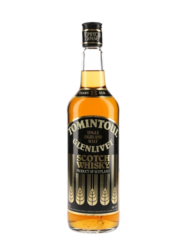 A bottle of Tomintoul Glenlivet 8 Year Old Single Highland Malt Scotch Whisky. This was produced and bottled by Whyte & Mackay, we estimate in the 1980s.
