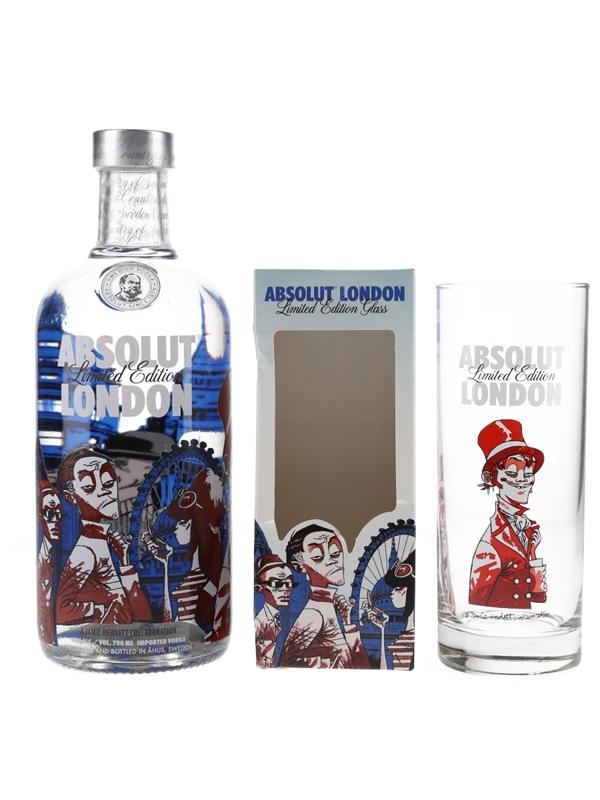 A limited edition bottle of Absolut London vodka from Sweden. The bottle features a design by Jamie Hewlett, an English artist best known for his work with the band Gorillaz. This comes with a branded glass.
