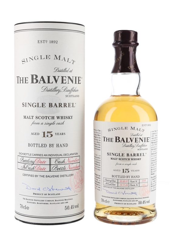 A bottle of Balvenie 15 Year Old Single Barrel Malt Scotch Whisky. This was distilled on 19 November 1984, matured in a single cask and bottled on 30 August 2001.