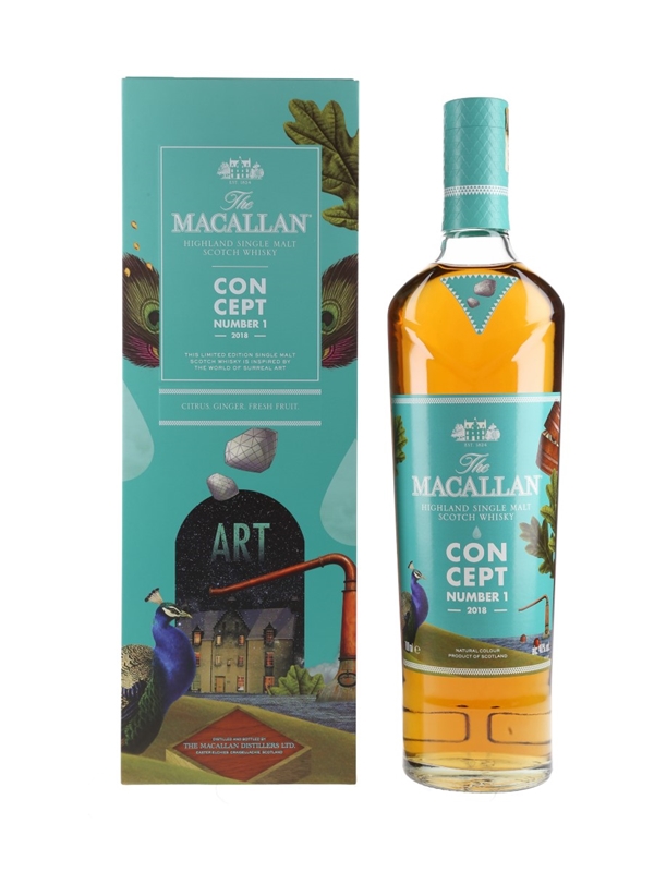 A bottle of The Macallan Concept Number 1 Highland Single Malt Scotch Whisky, a 2018 release inspired by surreal art. This is made from whiskies matured first in sherry seasoned oak casks and then for an equal period in ex-bourbon casks.