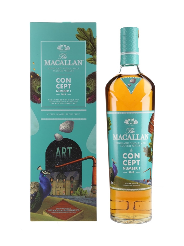 A bottle of The Macallan Concept Number 1 Highland Single Malt Scotch Whisky, a 2018 release inspired by surreal art. This is made from whiskies matured first in sherry seasoned oak casks and then for an equal period in ex-bourbon casks.