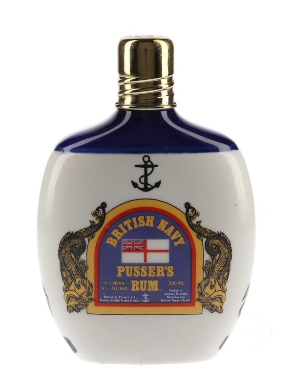 A 20cl bottle of Pusser's Navy Rum, presented in a ceramic hip flask decorated with traditional Royal Navy toasts. We estimate this was bottled in the 1970s to 1980s.