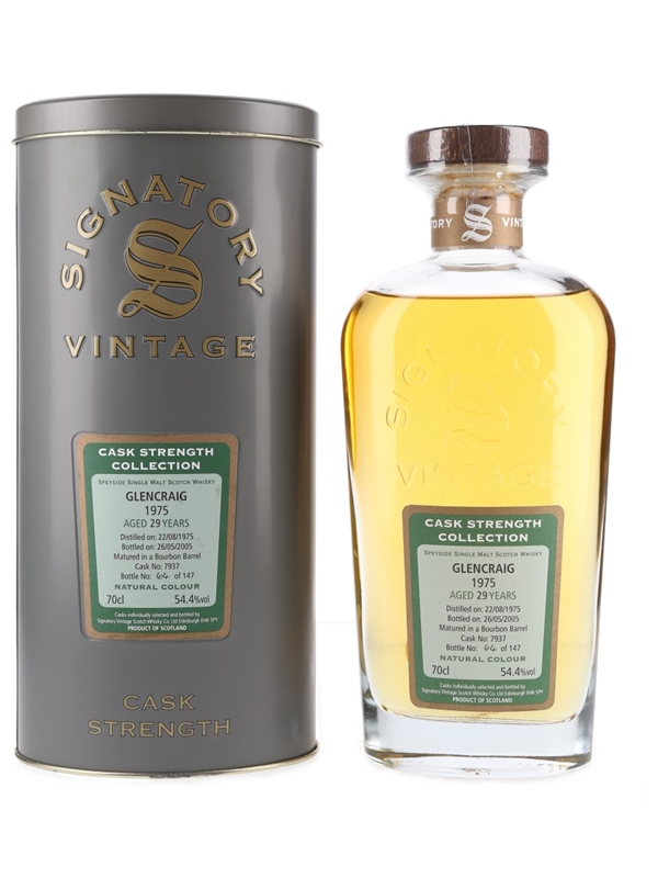 A bottle of Glencraig 29 Year Old Speyside Single Malt Scotch Whisky from independent bottler Signatory Vintage. This was distilled on 22 August 1975 and bottled from a single bourbon barrel on 25 May 2005 as a part of the Cask Strength Collection.