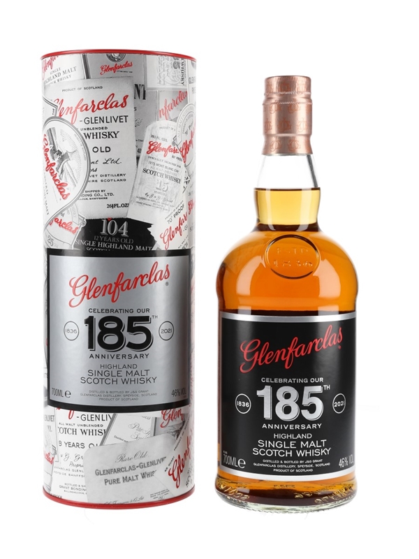A bottle of Glenfarclas Highland Single Malt Scotch Whisky, released to celebrate the distillery's 185th anniversary, 1836-2021.