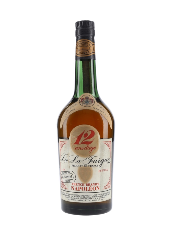 A bottle of De La Fargue 12 Year Old French Napoleon Brandy. This was produced by De La Fargue & C.Ie A Cognac and bottled for the Italian importer Bairo S.p.a., we estimate in the 1960s.