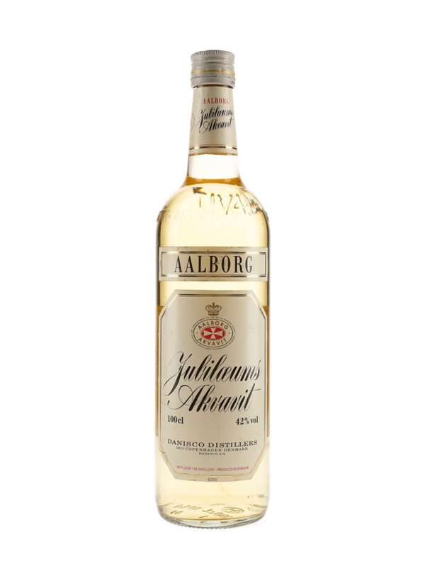 A litre bottle of Aalborg Jubilæums Akvavit, a Danish spirit flavoured with herbs and spices including caraway and/or dill.