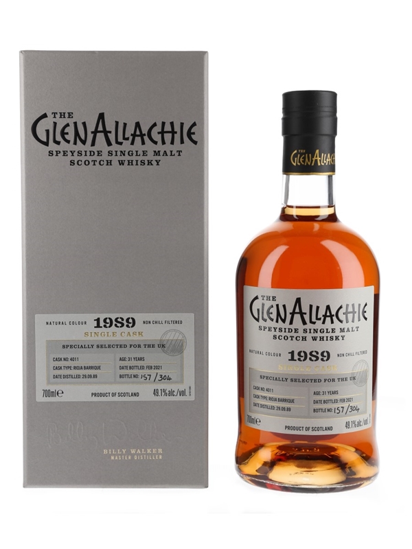 A bottle of Glenallachie 31 Year Old Single Cask Speyside Single Malt Scotch Whisky. This was distilled on 29 September 1989, matured in a Rioja barrique, bottled at 49.1% ABV in February 2021 and was specially selected for the UK.