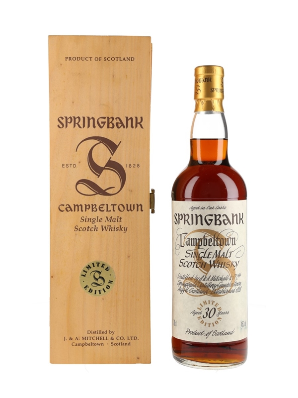 A bottle of Springbank 30 Year Old Campbeltown Single Malt Scotch Whisky, bottled as part of the Millennium series. This was originally sold as part of a set which included whiskies ranging from 25 to 50 years old.