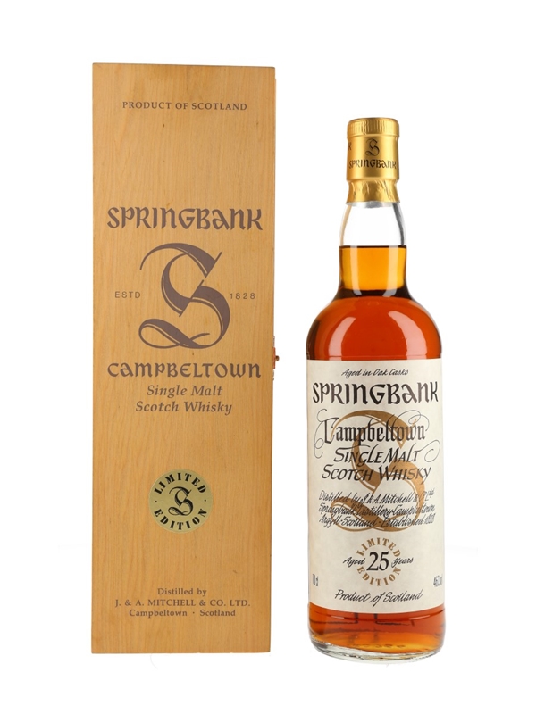 A bottle of Springbank 25 Year Old, bottled as part of the Millennium series. This was originally sold as part of a set which included whiskies ranging from 25 to 50 years old.