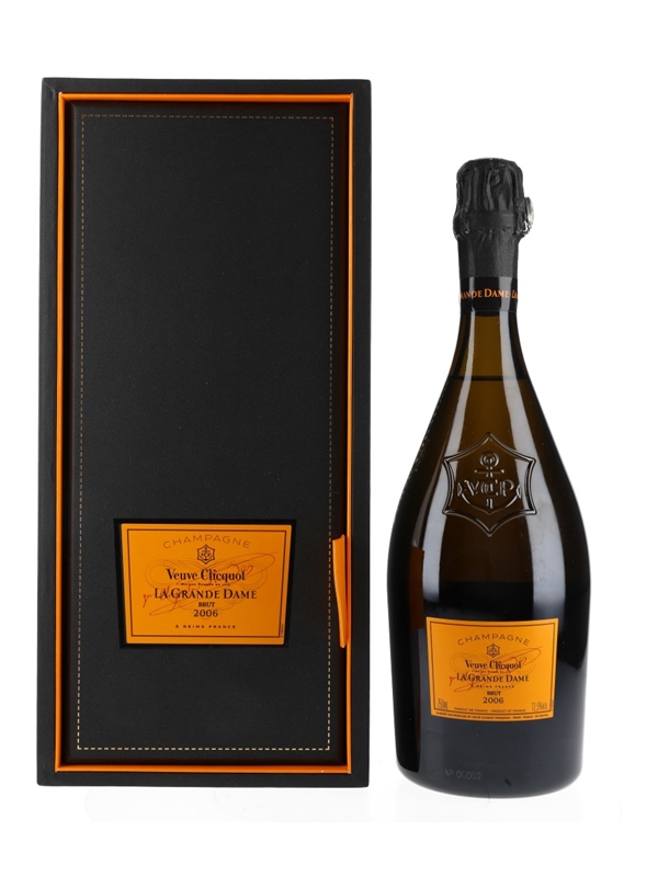 A bottle of La Grande Dame 2006, the flagship Prestige Cuvée Champagne from Veuve Clicquot, a blend of 53% Pinot Noir and 47% Chardonnay. This was harvested entirely from Grand Cru sites, the Pinot Noir from the villages of Ambonnay, Aÿ, Bouzy, Verzenay and Verzy, and the Chardonnay coming from Avize, Le Mesnil-sur-Oger and Oger.