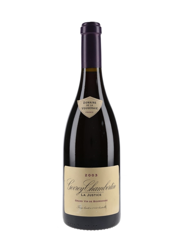 A bottle of 2003 Gevrey Chambertin La Justice from Burgundy producer Domaine de la Vougeraie. La Justice is made from two hectares of fruit from two distinct terroirs including a section of vineyard known as 'les graviers', which contributes an assertive, structured element to the finished wine. 3051 were bottles produced