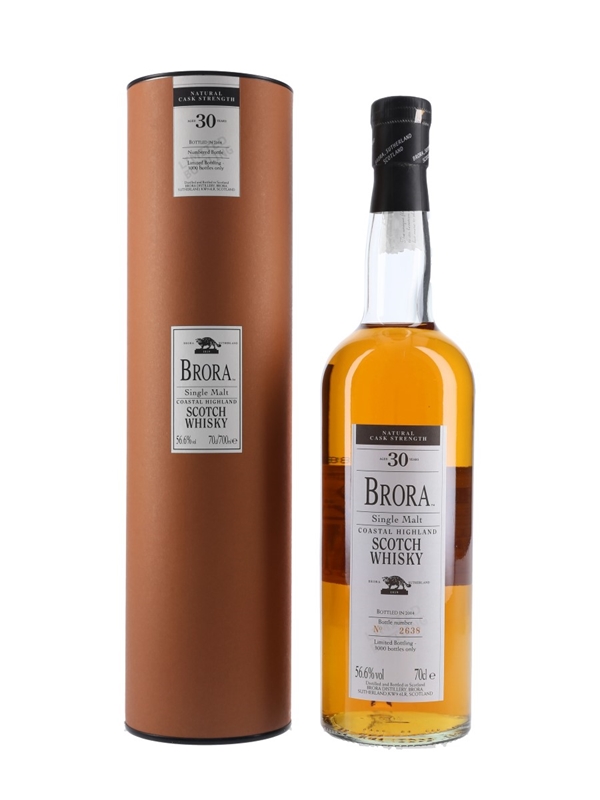 A bottle of Brora 30 Year Old Single Malt Coastal Highland Scotch Whisky. This is the third release in Diageo's series of Brora 30 Year Old bottled in 2004 at a natural cask strength of 56.6% ABV.