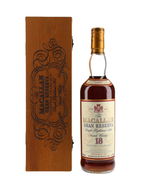 A bottle of The Macallan Gran Reserva 18 Year Old Single Highland Malt Scotch Whisky. This was distilled in 1979, matured in sherry casks and bottled in 1997.
