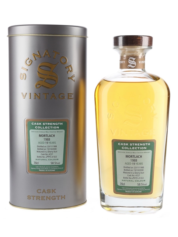 A bottle of Mortlach 19 Year Old Speyside Single Malt Scotch Whisky. This was distilled on 23 November 1988, matured in a sherry butt, and bottled on 15 October 2008 by Signatory Vintage as part of the Cask Strength Collection.