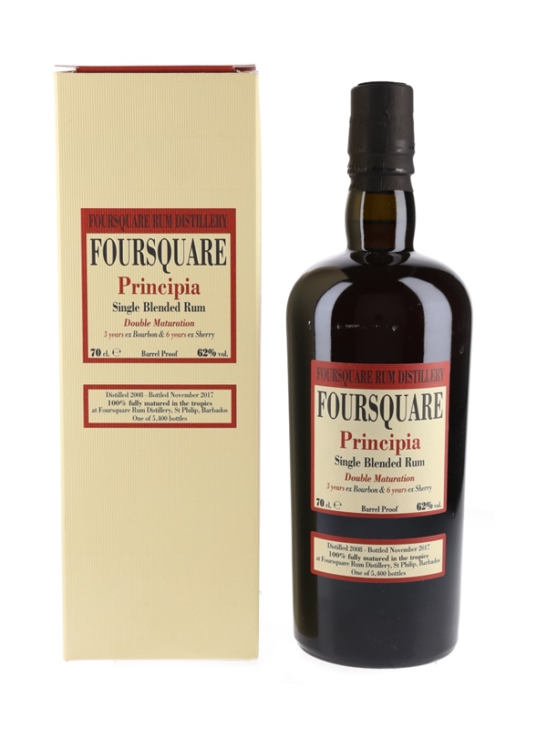 A bottle of Foursquare Principia 9 Year Old Single Blended rum from Barbados. This rum was distilled in 2008, matured in two types of cask, spending three years in ex-bourbon barrels and six years in ex-sherry casks, before blending and bottling in November 2017 by Velier.