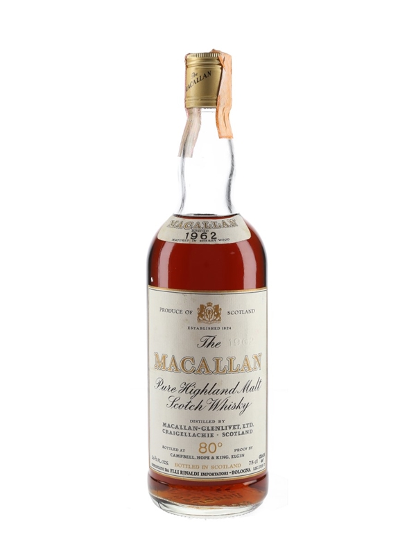 A bottle of The Macallan 1962 Pure Highland Malt Scotch Whisky, distilled in 1962 and bottled by Campbell, Hope & King. This was bottled for the Italian market and imported by Rinaldi, we estimate in the 1970s.