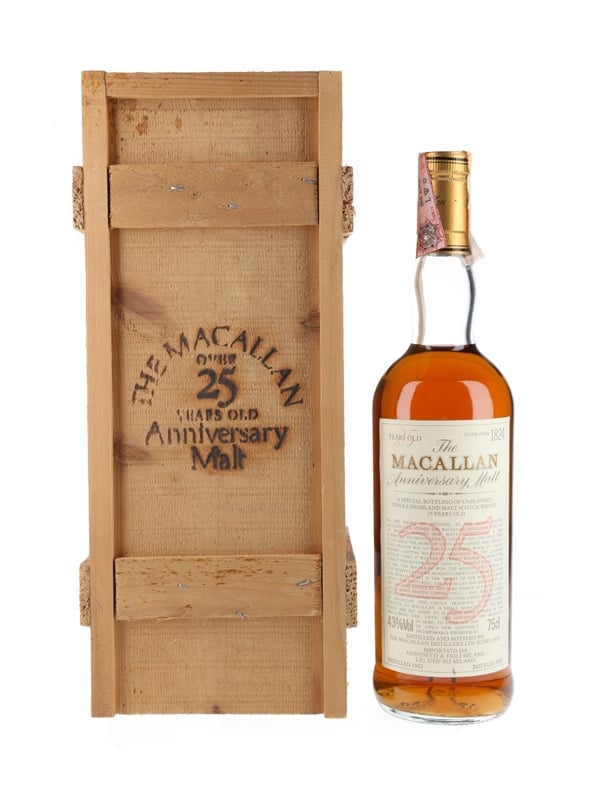 A bottle of The Macallan 1962 Single Highland Malt Scotch Whisky. This was matured in sherry casks for 25 years and bottled in 1988 as part of the Anniversary Malt series. This was produced for the Italian market and imported by Giovinetti & Figli.