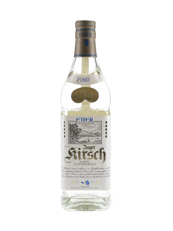 A bottle of Etter Zuger Kirsch from Switzerland, distilled in 1980.