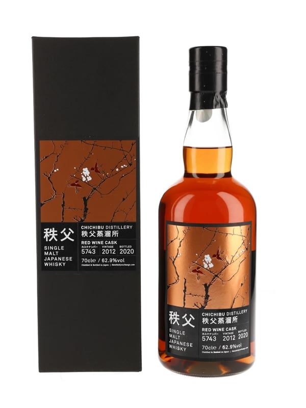 A bottle of Chichibu 2012 Japanese Single Malt Whisky. This was distilled in 2012 from the Braemar barley variety, matured in a Kusuda red wine cask and bottled at cask strength in 2020.