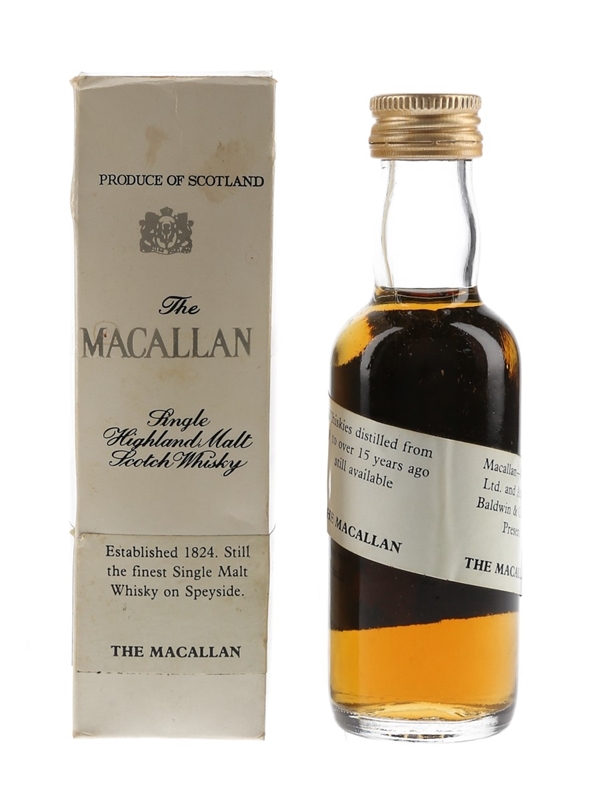 The label reads: Established 1824. Still the finest Single Malt Whisky on Speyside. Whiskies distilled from 10 to over 15 years ago still available. Macallan-Glenlivet Ltd. and Atkinson, Baldwin & Co. Ltd. Present The Macallan. To be launched in the United Kingdom in Autumn 1979.