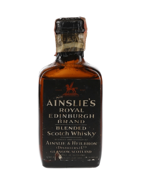 A miniature bottle of Ainslie's Royal Edinburgh Brand Choice Scotch Whisky, produced by Ainslie & Heilbron Ltd. and imported to the US by Hulse Import Co. We estimate this was bottled in the 1940s to 1950s.