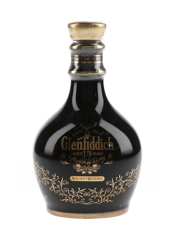 A bottle of Glenfiddich 18 Year Old Ancient Reserve, presented in a black ceramic decanter.
