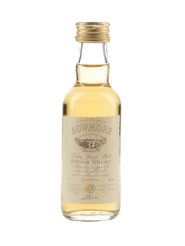 A miniature bottle of Bowmore 10 Year Old Islay Single Malt Scotch Whisky, bottled to celebrate the Glasgow Garden Festival in 1988.