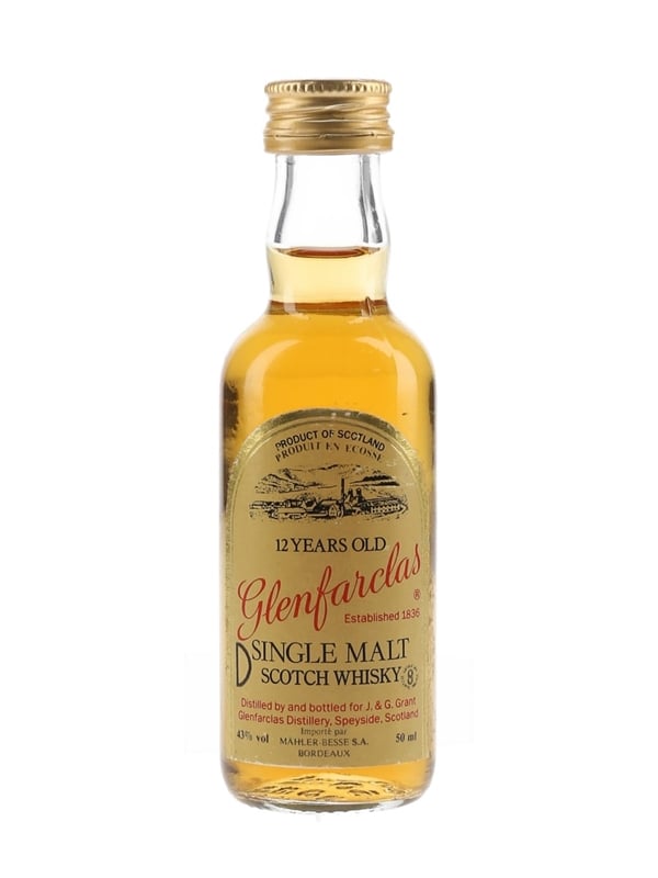 A miniature bottle of Glenfarclas 12 Year Old Single Malt Scotch Whisky. We estimate this was bottled in the 1980s. This was imported to France by Mahler Besse, Bordeaux.