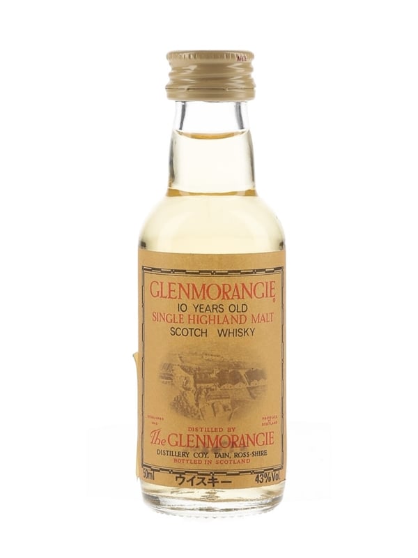 A miniature bottle of Glenmorangie 10 Year Old Single Highland Malt Scotch Whisky. We estimate this was bottled in the 1990s. This was imported for the Japanese market.
