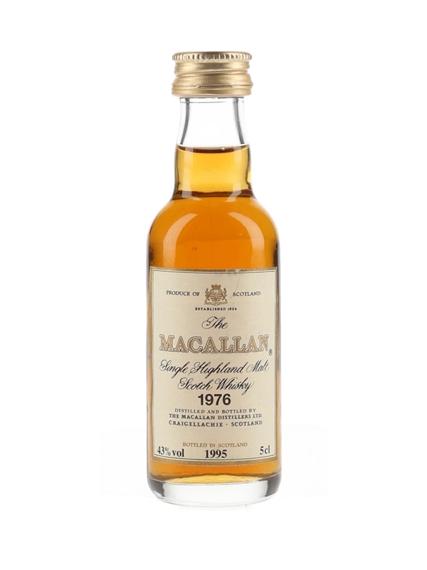 A miniature bottle of The Macallan 1976 Single Highland Malt Scotch Whisky. This was distilled in 1976 and bottled in 1995 at 43% ABV.
