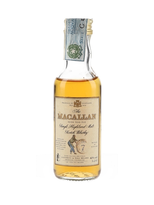 A miniature of The Macallan 7 Year Old Single Highland Malt Scotch Whisky. This was imported to Italy by Giovinetti & Figli, we estimate in the 1980s.