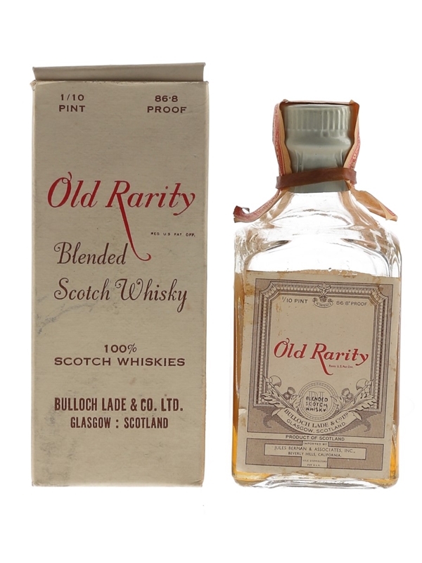 A miniature bottle of Old Rarity Blended Scotch Whisky, bottled by Bulloch Lade & Co. Ltd. This was imported to the US by Jules Berman & Associates Inc., we estimate in the 1950s.