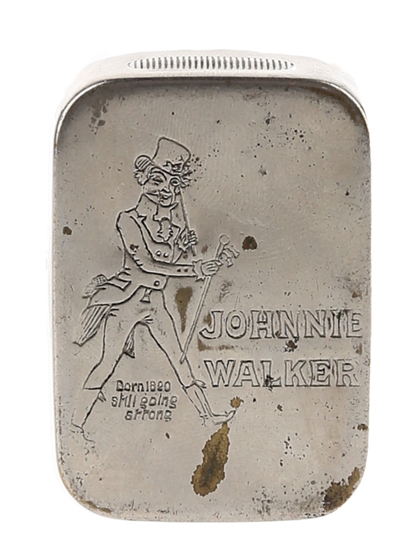 A metal Johnnie Walker vesta match case. A puzzle must be solved to open the case, and the back reads 'Open this box and I'll stand you a Johnnie Walker'.
