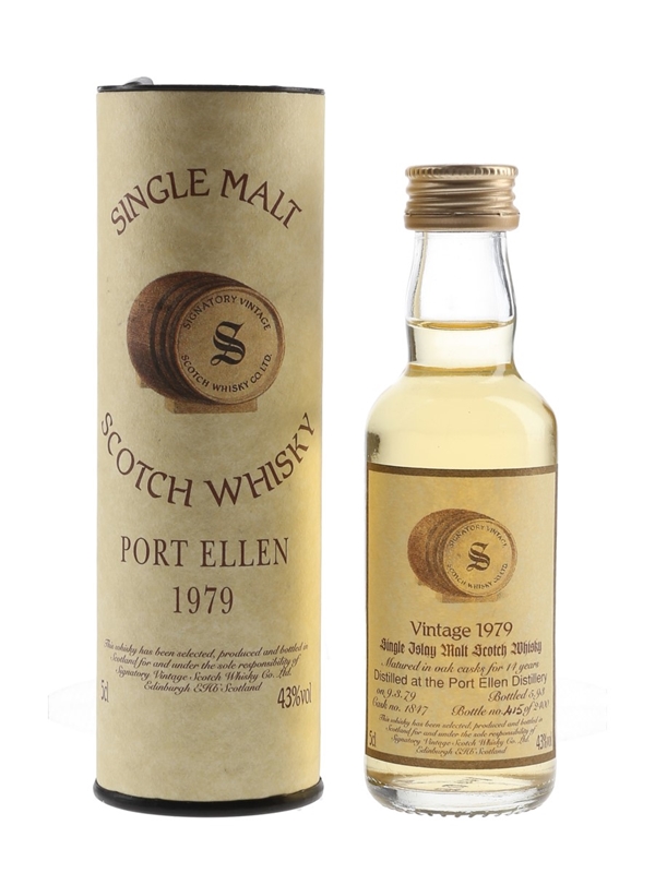 A miniature bottle of Port Ellen 14 Year Old Single Islay Malt Scotch Whisky. This was distilled on 9 March 1979, matured in a single cask for 14 years and bottled in May 1993 by Signatory Vintage.