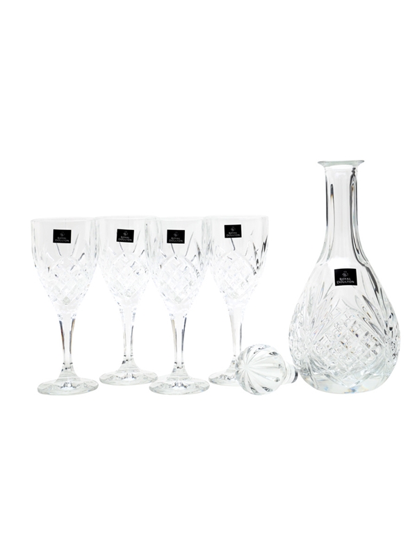 The Royal Doulton Crystal Giftware contains four fine lead crystal glasses and a wine decanter with stopper. These were produced in Slovakia.