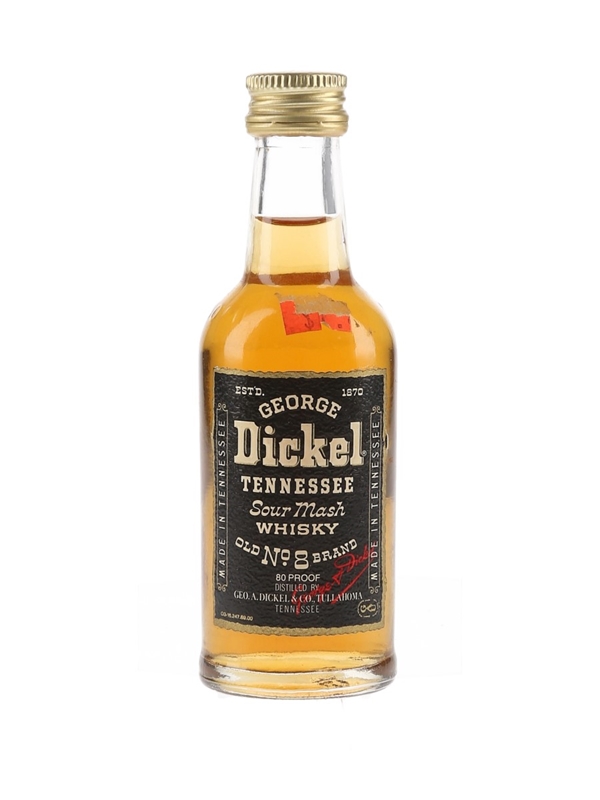 A miniature bottle of George Dickel Tennessee Sour Mash Old No. 8 Brand, distilled by Geo A Dickel & Co., we estimate in the 1970s.