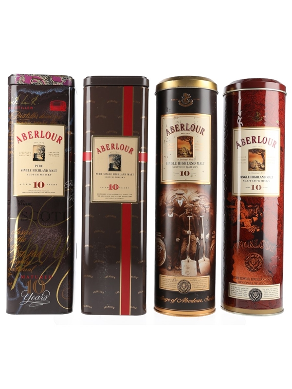 A selection of four empty Aberlour whisky tins, originally for the 10 Year Old expression. These were produced in the 1990s to 2000s.