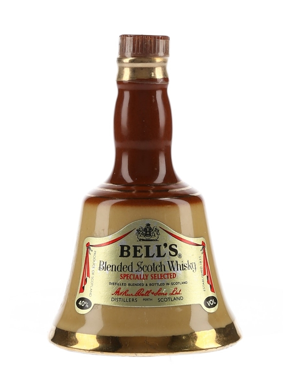 A miniature bottle of Bell's Specially Selected Blended Scotch Whisky produced by Arthur Bell & Sons Ltd. and presented in a brown Wade ceramic decanter. We estimate this was bottled in the 1980s.