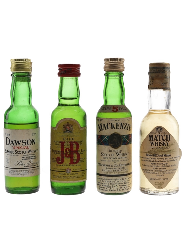 This lot contains four miniature bottles of blended Scotch whisky including Peter Dawson Special, Justerini & Brooks Rare, The Real Mackenzie 5 Year Old and Match Whisky 5 Year Old.