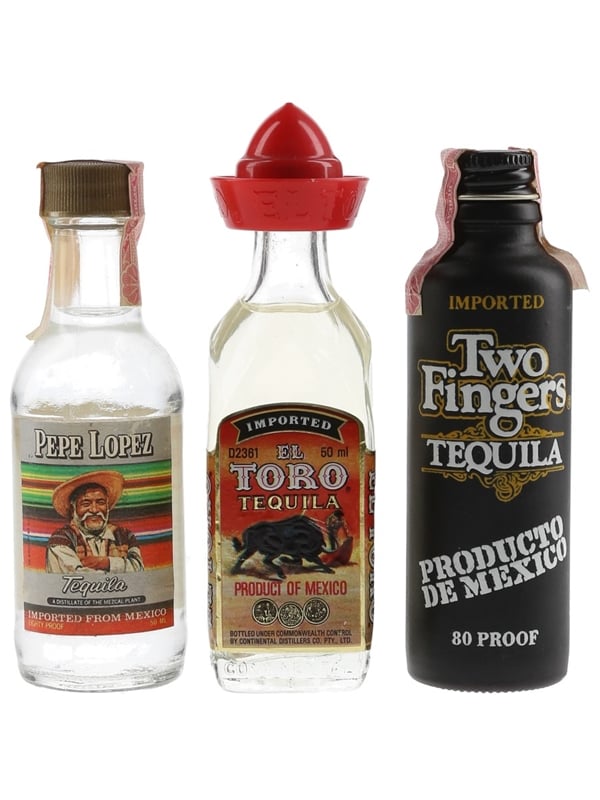 This lot contains three miniature bottles of Tequila from Mexico, including El Toro, Pepe Lopez and Two Fingers.
