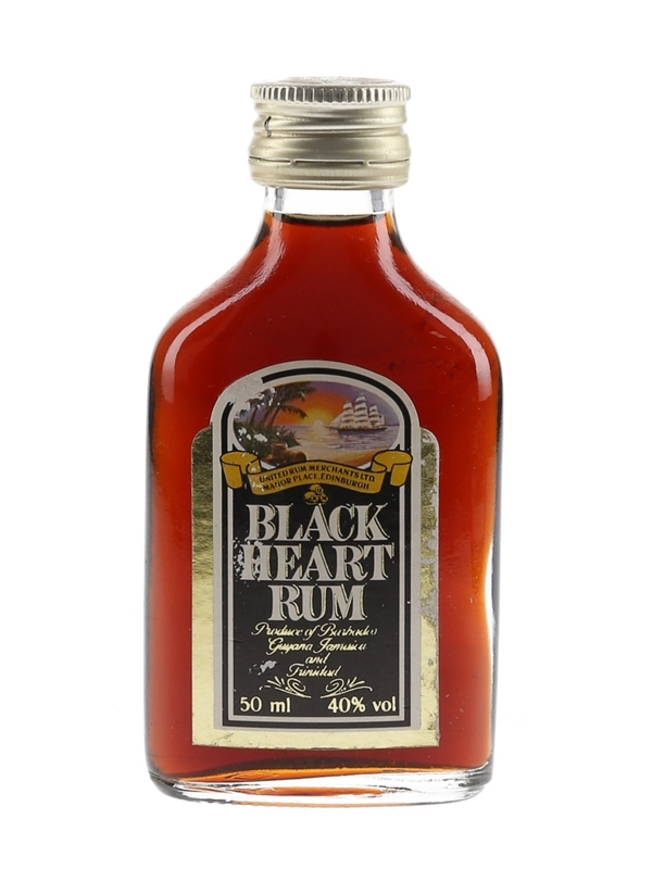 A miniature bottle of Black Heart Rum, produce of Barbados, Guyana, Jamaica and Trinidad. This was bottled by United Rum Merchants Ltd, we estimate in the 1980s.