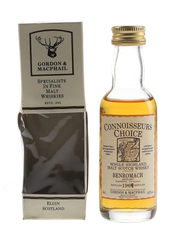 A miniature bottle of Benromach 1968 Single Highland Malt Scotch Whisky. This was distilled in 1968 and bottled by Gordon & MacPhail as part of their Connoisseurs Choice series, we estimate in the 1990s.