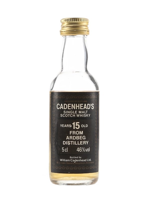 A miniature bottle of Ardbeg 15 Year Old Single Malt Scotch Whisky, bottled at 46% ABV by independent bottler Cadenhead's. We estimate this was bottled in the 1980s.