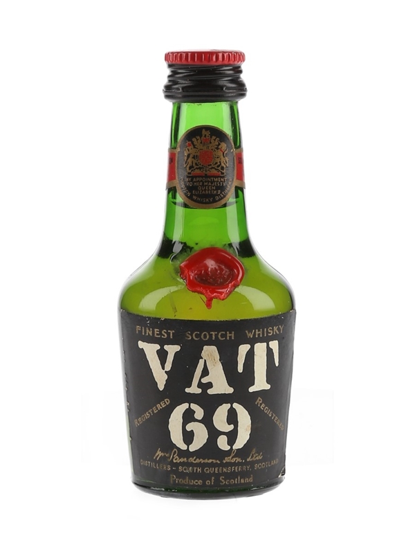 A miniature bottle of Vat 69 Finest Scotch Whisky produced by Sanderson & Son Ltd. We estimate this was bottled in the 1960s.